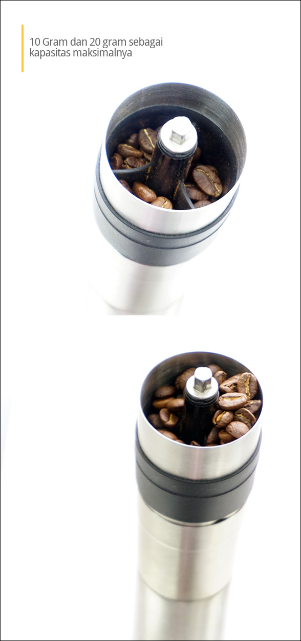 Conical Burr : Bagian kedua adalah hopper bean atau tempat biji kopi berikut alat grind yang menggunakan sistem konikal dengan bahan dari keramik. Agar penutupnya tidak kewalahan menampung biji kopi, daya muat maksimal adalah 20 gram, cukuplah untuk dua cangkir kopi.