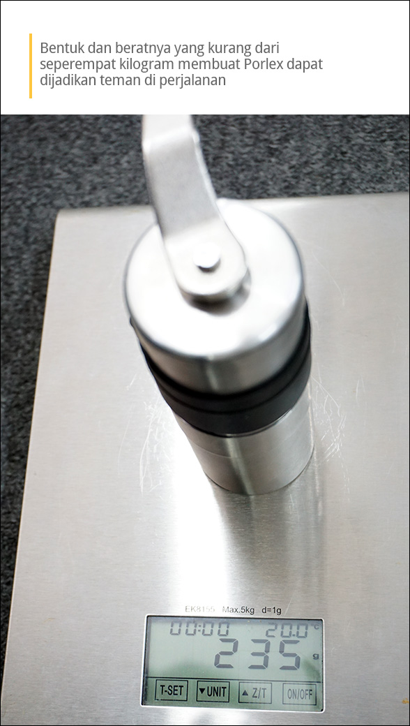Selebihnya, bentuk Porlex yang ringkas (satu lagi dengan model yang lebih besar) akan menjadi pendamping setia diperjalanan jauh. Atau bagi siapa saja yang menemukan ekstasi tersendiri saat bekerja keras memutar tuas puluhan kali demi secangkir kopi. Oh ya, sekaligus secara tidak langsung melatih kekuatan otot bicep Anda.
