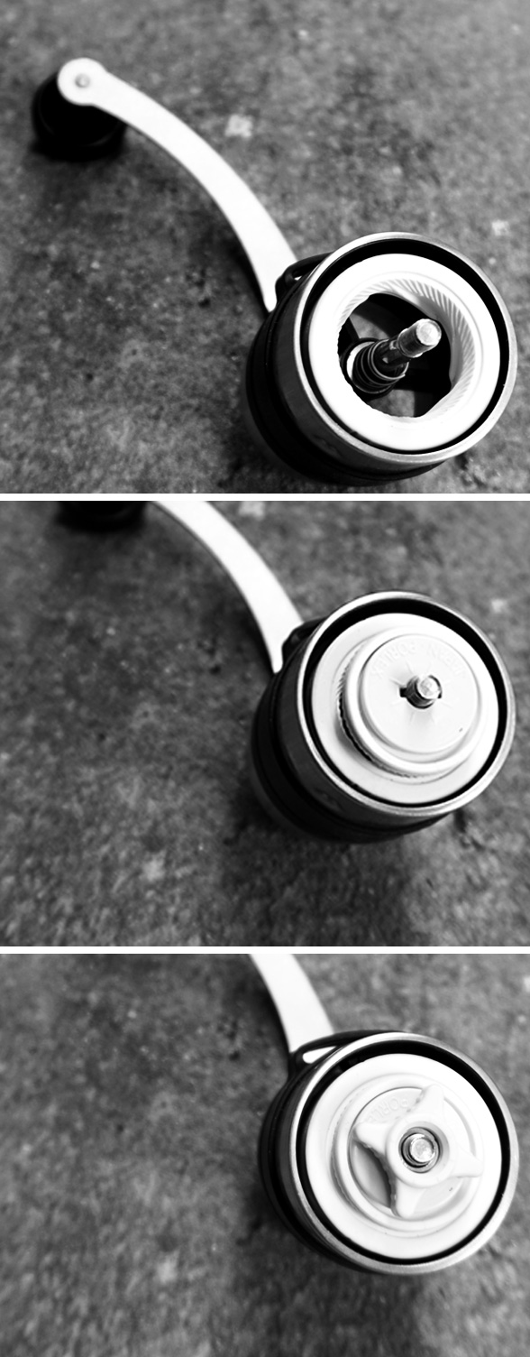 Buat saya, hal pertama yang membedakan kualitas sebuah grinder adalah kemudahan melakukan adjustment atau pengaturan halus-kasarnya bubuk kopi yang dihasilkan, selain konsistensinya. Pada Porlex, perubahan grind size atau bubuk kopi dilakukan dengan memutar sebuah baut berbentuk bintang yang bisa dilepas dengan 10 kali putaran dari posisi yang paling halus.