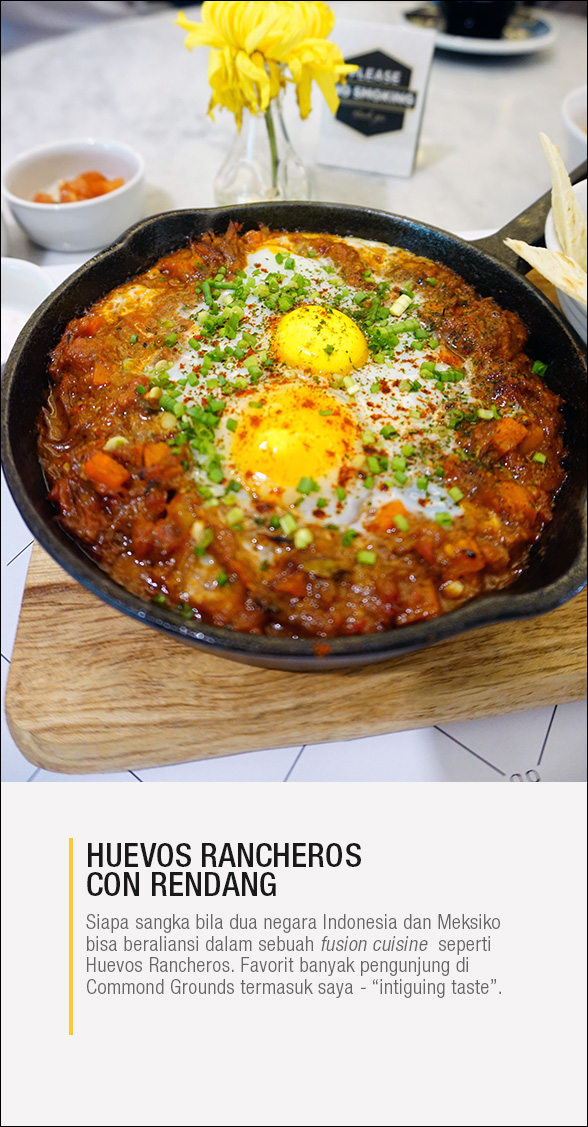 Mereka juga yakin bila makanan adalah pintu gerbang bagi siapa saja yang ingin menikmati kopi terbaik di Common Grounds. Tanpa berpretensi untuk meniru coffee shop di Australia, Common Grounds mencoba mengenalkan kultur “brunch” karena mereka juga menyasar tamu banyak asing yang sering bertandang ke sini. Cobalah Egg Benedict dan Huavos Ranchreos con Rendang, dua favorit menu brunch yang biasa saya nikmati bila ke tempat ini.