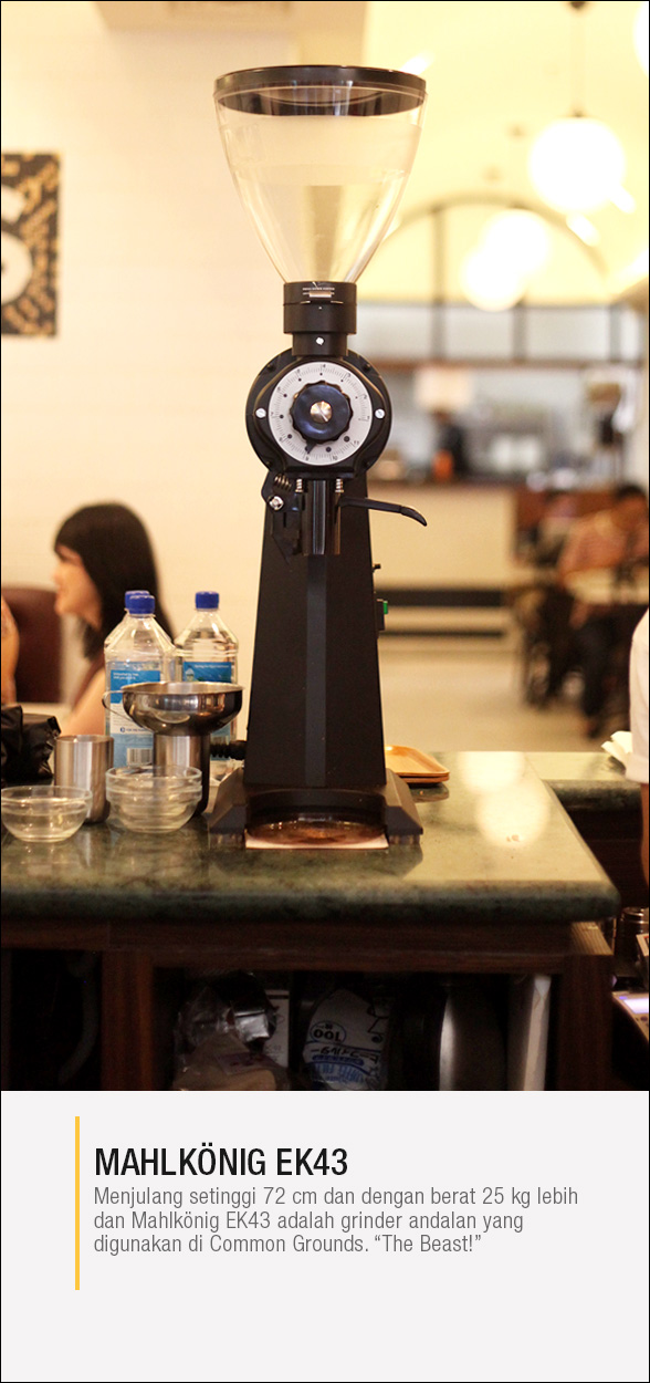Coffee Book + Mahlkonig EK43. Setiap Barista di Common Grounds dibekali dengan sati buku kecil yang berisikan catatan mengenai cita rasa kopi yang telah meraka cicipi. Buku tersebut tentunya sangat penting kata Aston, karena Barista harus terus mengasah palate-nya terutama pada saat berinteraksi dengan pengunjung.
