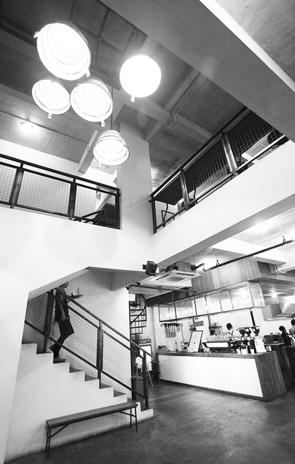 Terdiri dari dua lantai, dan di ruangan tengah terdapat meja kayu panjang tanpa sambungan lalu di tambah dengan beberapa tempat duduk lain. Ruangan berwana terang dan asken biru tanpa pembatas dengan sedikit mengambil tema industrial.
