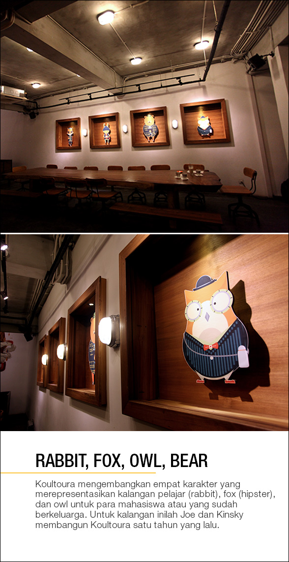 Masuklah ke bagian dalamnya dan Anda akan disambut dengan empat karakter yang berada dalam empat bingkai berupa : rabbit, fox, owl, dan bear sebagai perlambang kalangan hipster, pelajar, mahasiswa dan keluarga.