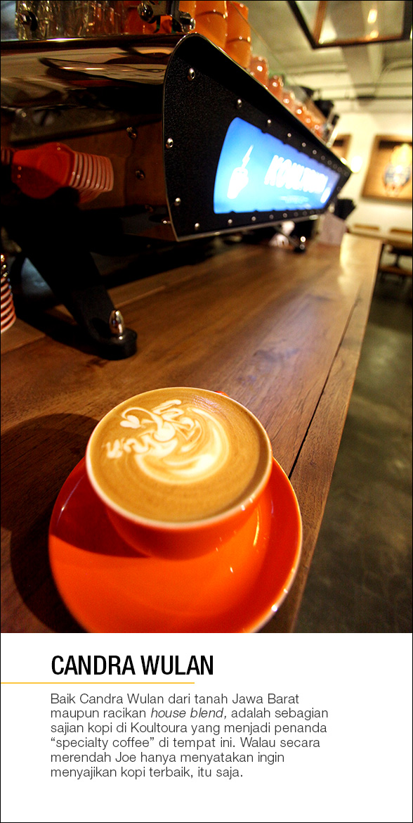 Pemilihan lokasi bukannya tak memperhitungkan resiko yang akan dihadapi dan budaya kopi tentunya belum melekat, kalau tidak boleh dikatakan masih absen di keseharian warga Jakarta Barat. Untuk itulah Joe Sentoso (33), pemilik Koultoura, sejak awal, selain rancangan kopi dan makanan, ia juga sudah merencakan konsep desain yang sebisa mungkin mewakili semua kalangan.
