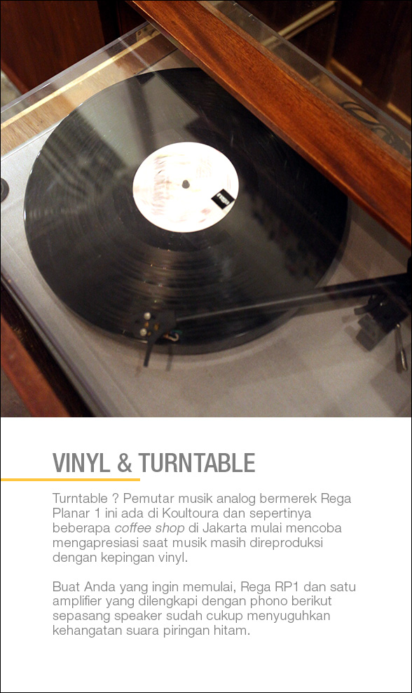 Tunggu dulu, sekilas saya melihat pemutar piringan hitam atau turntable dengan merek yang sama dengan yang digunakan di rumah. Rega RP1 terpajang di pojok kanan saat Anda masuk Koultoura yang menurut Joe hanya diputar pada saat akhir pekan saja. Cukup buat saya, tapi syukur bila Anda berpendapat sama, bahwa kehadiran pemutar piringan hitam di sebuah coffee shop sepertinya memberikan sedikit sentuhan artistik dan seksi !.