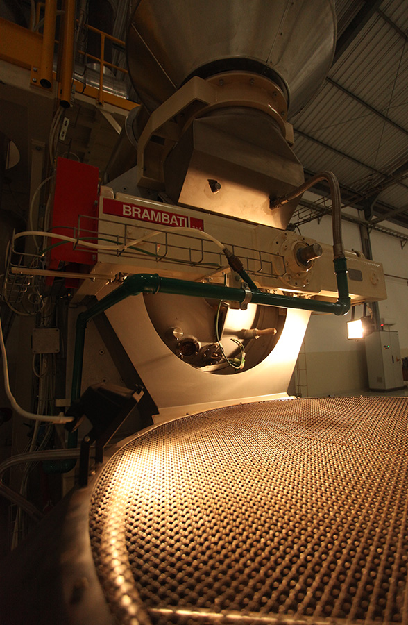 Kami melanjutkan tur dengan memasuki ruangan sebelahnya yang hampir seluas lapangan sepak bola. Suara mesin yang mendengung halus adalah tanda kehidupan dari mesin roasting Brambati tipe KS-120 yang sedang melakukan tugasnya setelah menerima kopi dari silo. Mesin tipe “KS Universale” kapasitas 120 kilogram di Victo Oro Prima merupakan kelas menengah dari jajaran produk perusahaan Brambati yang di mulai dari 30 hingga terbesar 600 kilogram per batch.