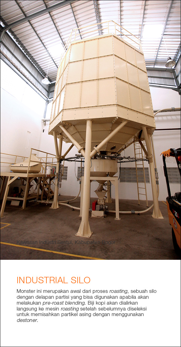 Di ruangan selanjutnya, sebuah silo biji kopi berdiri tegak setinggi ruko tiga lantai. Di dalamnya terdapat delapan partisi atau dinding pemisah yang diperuntukan untuk masing-masing biji kopi pada saat akan melakukan pencampuran atau pre-roast blending, kesemuanya dilakukan dengan memencet tombol panel komputer.