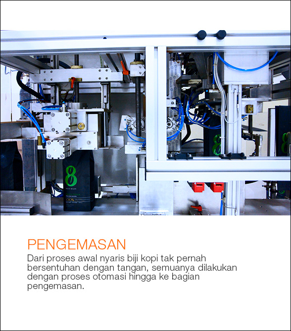 Sebelum masuk ke bagian pengemasan, kopi terlebih dahulu digiling khusus untuk produk yang memang dikemas untuk kopi bubuk. Bila tidak, maka biji kopi akan secara otomatis masuk ke dalam kemasan yang sudah disediakan yang dalam hal ini untuk volume satu kilogram. Saat sudah selesai dalam bilangan detik, pekerja hanya tinggal memasukan kopi ke dalam karton. Kesemua proses sejak awal hingga akhir dilakukan nyaris tanpa pernah adanya sentuhan secara fisik dengan kopi.