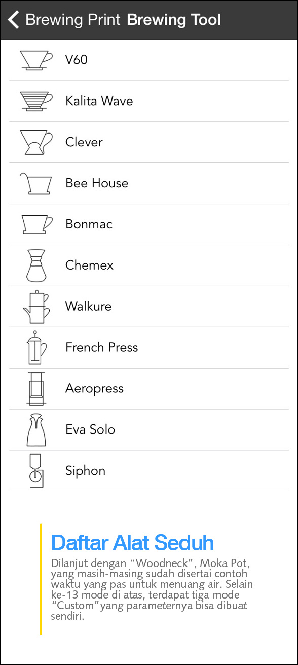 Sebanyak 13 jenis alat seduh sudah tersedia dan tiga mode “Custom” bila ingin lebih spesifik dalam membuat catatan resep yang tentu bisa disesuaikan parameternya.
