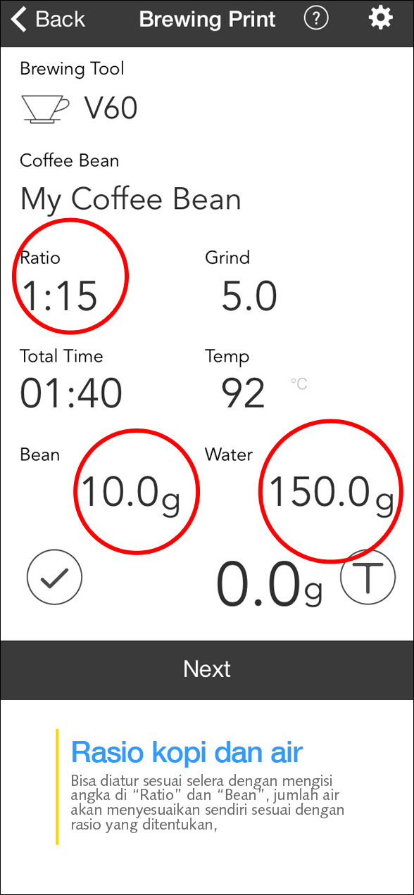 Selanjutnya tinggal masukan angka “Ratio” dan “Bean”, sedangkan volume atau jumlah air akan menyesuaikan sendiri berdasarkan rasio yang kita tentukan,