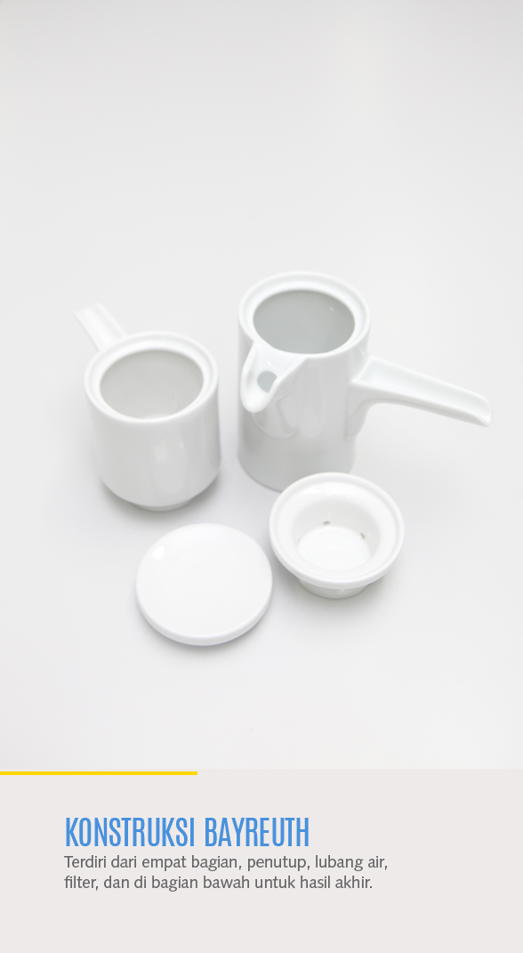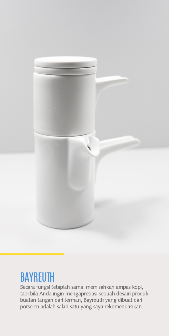 Fungsinya sama, menyaring kopi agar ampasnya terpisah, tapi Bayreuth yang diproduksi oleh tangan artisan dari Walküre Porzellanfabrik di Jerman, menurut saya adalah salah satu desain produk kopi terbaik setelah Chemex dari negara yang sama. Material Bayreuth bukan kaca atau keramik, tapi porselen dan sekali lagi, cantik !