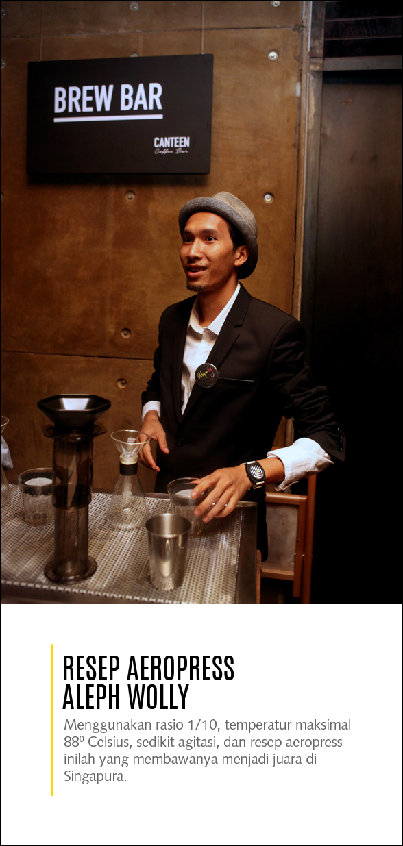 Kali ini Canteen Coffee Bar yang berkoloborasi dengan Sukanda Djaya, menyuguhkan ketiga jenis kopi dari Toby’s dengan menggunakan teknik seduh alat Aeropress. Tak salah bila mereka secara khusus mendatangkan Aleph Wolly (26), warga Singapura yang menjadi juara Aeropress di negaranya tahun 2014.