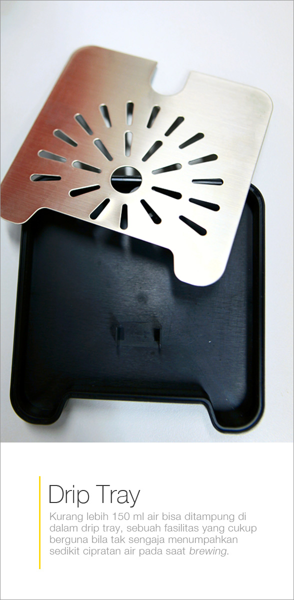 Satu drip tray disertakan dalam paket yang bisa ditumpangkan di atas kaca agar cipratan air tak melebar kemana-mana, walau Bonavita menyatakan bahwa alatnya tahan air atau waterproof. Tatakan ini sebenarnya digunakan untuk dripper yang khusus dirancang satu paket dengan timbangan ini, tapi dijual terpisah.