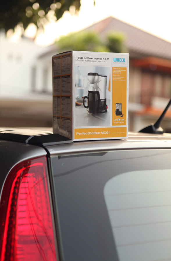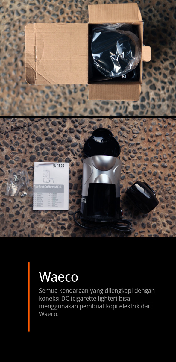 Saya merasakan sendiri bahwa tak mudah mencari air panas untuk menyeduh kop pada saat berkendara dalam perjalanan panjang ke luar kota. Anda bisa menggunakan termos Zojirushi dan menyiapkan sebelum keberangkatan. Atau cara lain adalah dengan membawa Waeco, penyeduh kopi elektrik yang tinggal dipasangkan di koneksi DC 12 volt pada mobil Anda. Saya mencoba alat ini bagi pembaca yang sering melakukan perjalanan jarak jauh dan tak ingin lepas dari kehangatan secangkir kopi.