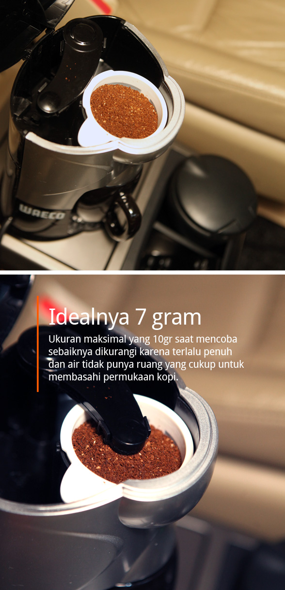 Penggunaannya juga sangat sederhana, terlebih bagi Anda yang sudah terbiasa memanfaatkan coffee maker baik di rumah maupun kantor. Tinggal isi filter dengan kopi dan masukan air tak lebih dari kapasitas cangkir yang hanya 120mm. Sambungkan koneksi ke sumber DC, lalu sebuah tombol merah yang berada di samping kanan tinggal ditekan untuk menyalakan Waeco. Selanjutnya selama lebih kurang 4-5 menit secangkir kopi panas sudah tersaji di dalam mobil.