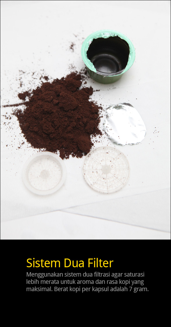 Setiap kapsul yang diisi oleh 8 gram kopi dilengkapi dengan sistem dua filter di bagian atas dan bawah dengan lubang kecil di seluruh permukaannya untuk menjamin saturasi yang lebih merata.