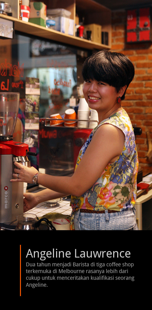 Menyesal ? Sebaliknya, malah Angel mensyukurinya dan selama dua tahun ia berjibaku sebagai Barista di Cafenatics, Top Paddock, serta Market Lane, tiga nama yang punya repurtasi sebagai specialty coffee shop di kota Melbourne.