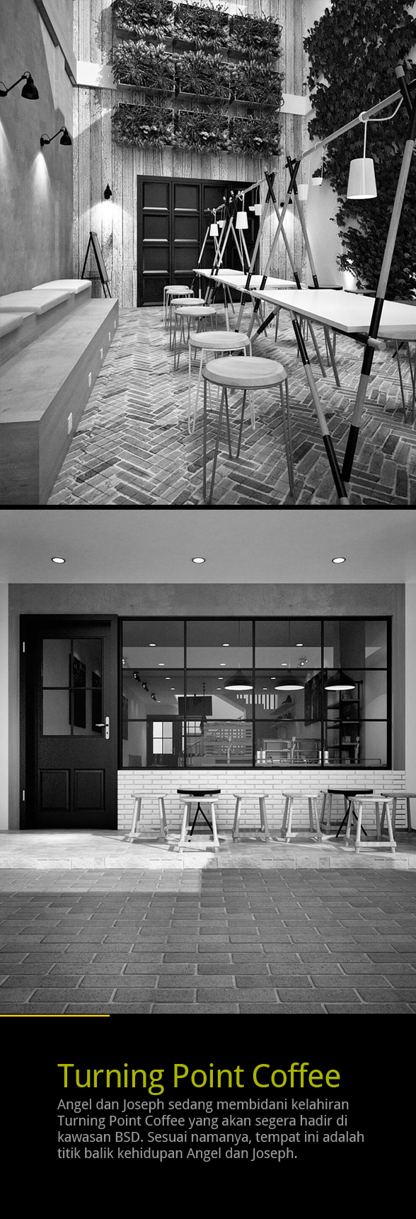 Nantikan kehadiran Turning Point yang sudah dalam taraf penyelesaiaan, sebuah coffee shop di kawasan BSD hasil karya pasangan Angel dan Joseph. Namanya, sebagaiman makna yang terkandung, sebuah titik balik kehidupan pasangan ini. Sebagai pemilik sekaligus Barista-nya mereka berkomitmen untuk terjun langsung terutama melakukan engagement kepada konsumen pada sat Turning Point mulai beroperasi.