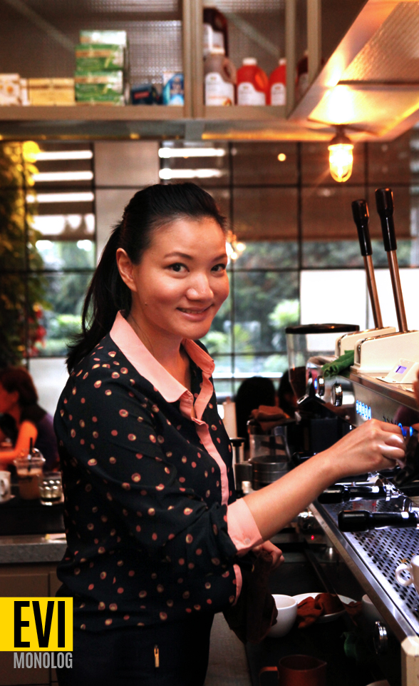 Bila sesekali ke Monolog baik yang di Plaza Senayan atau Pondok Indah Mall Jakarta mungkin Anda akan bertemu dengan Evi yang sesekali mengoperasikan mesin espresso dengan sistem piston dan tentu piawai membuat latte art. Digembleng oleh Franky Angkawijaya, Barista Guru di Indonesia yang mengelola Esperto Barista Course dan Evi kini bertanggung jawab mengelola Monolog bersama beberapa rekannya.