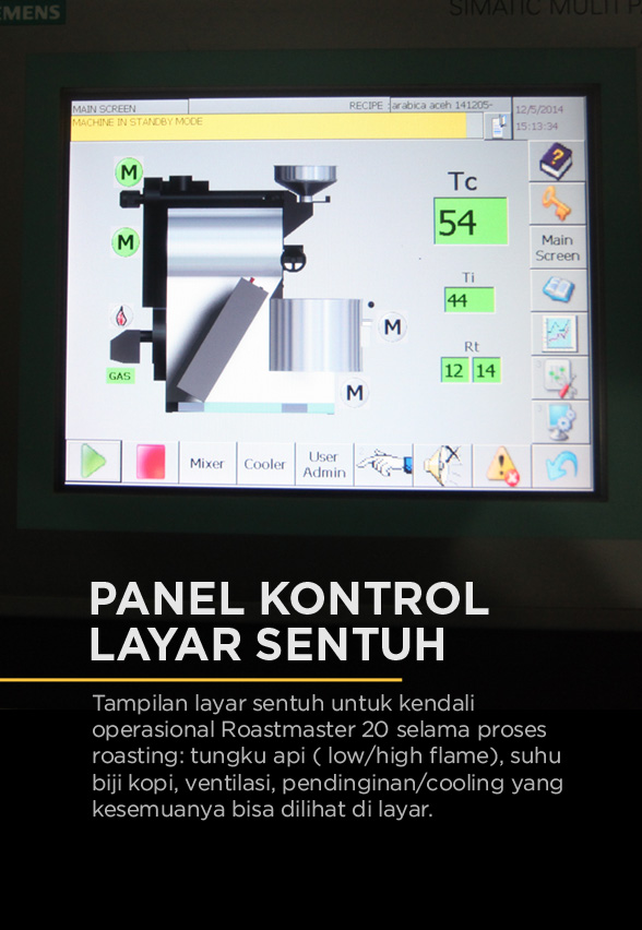 Kembali lagi ke Roastmaster 20, di sebelah kirinya terpasang perangkat PLC (Programmable Logic Controller) sebuah piranti lunak untuk menentukan semua parameter roasting dari mulai suhu, waktu, kecepatan drum (high/low), suhu biji kopi, bukaan ventilasi, pendinginan.
