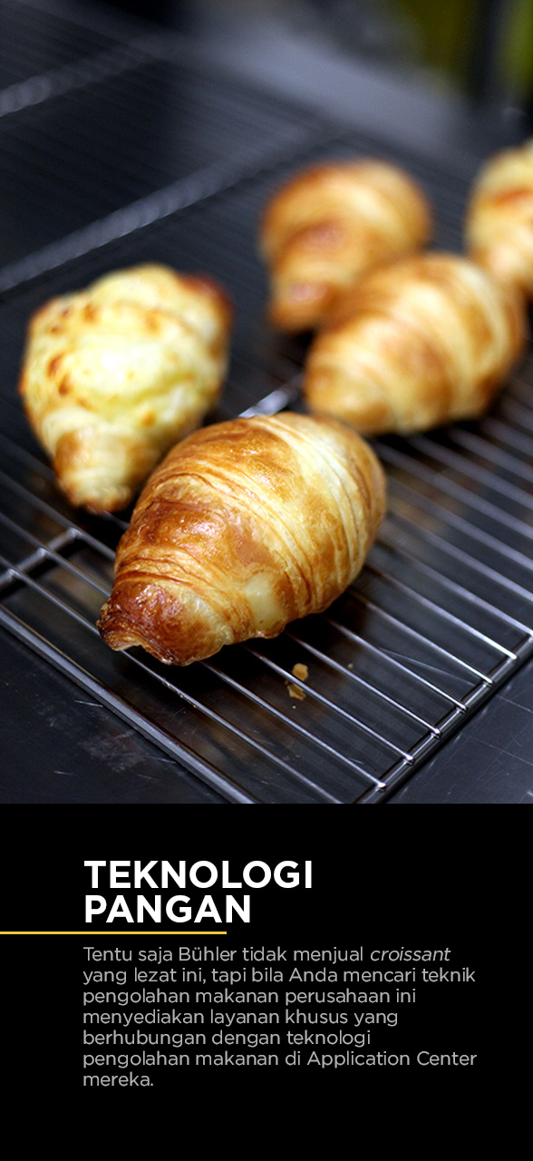 Naik tangga menuju ke lantai berikutnya, aroma bakery sudah tercium saat salah satu staff-nya menunjukan bagaimana teknologi pangan dari Bühler bisa meningkatkan kelezatan croissant. Dengan bahan terbaik dan campuran khusus yang dikembangkan oleh Bühler maka rasa croissant dengan lapisan atas yang renyah, ah sudahlah, sulit dijelaskan.