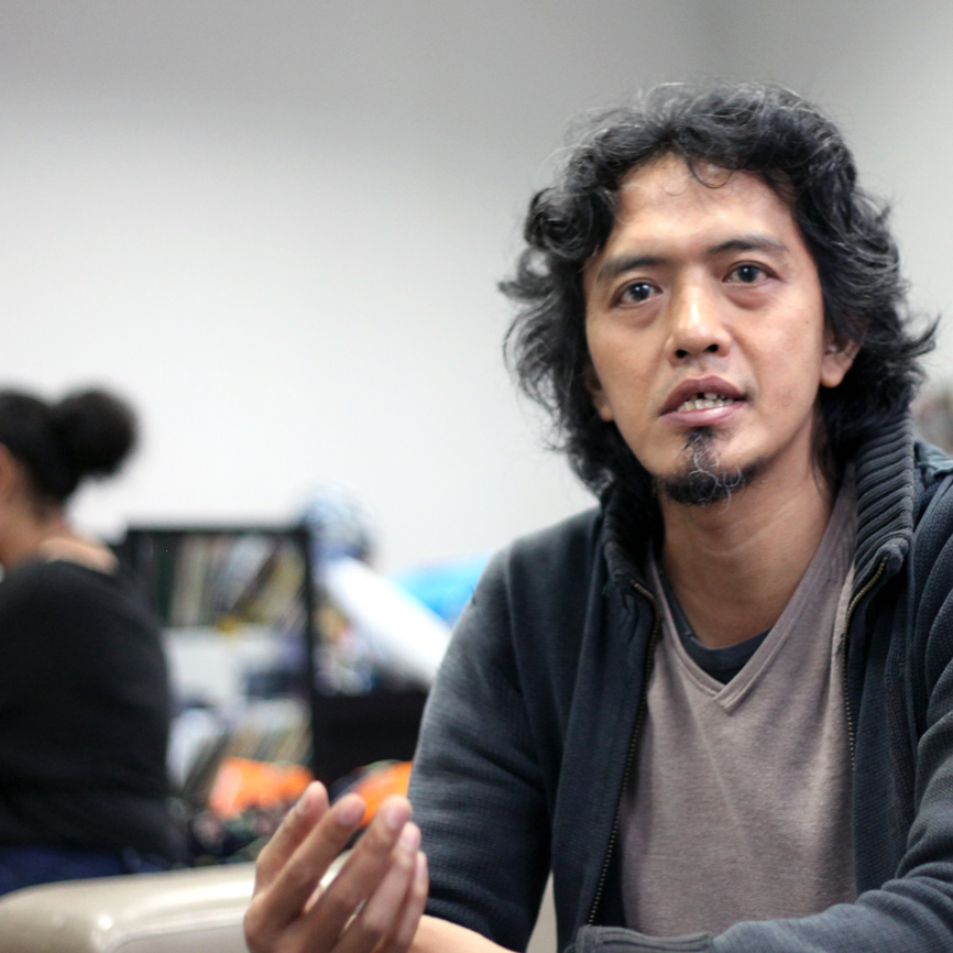Saat berkunjung, di kantornya banyak berkumpul para penggiat seni dibidang komik yang sedang berdiskusi dan membicarakan berbagai kegiatan yang sedang mereka rancang. Di rak buku terdapat pustaka yang tentu saja berkaitan dengan seni dan komik dan saya melihat beberapa komik legenda karya RA Kosasih dan Ganes TH yang sudah dipercantik kembali.