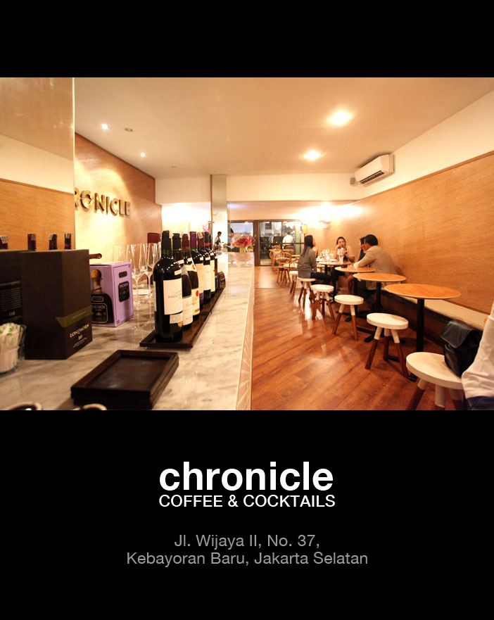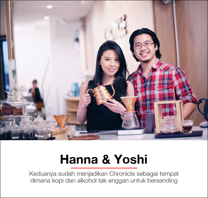 Tidak sulit mendapatkan cocktail di berbagai bar yang tersebar di seantero Jakarta, tapi bagaimana bila tempat tersebut juga menyajikan specialty coffee ? Di Chronicle Anda bisa mendapatkan keduanya, sebuah tempat yang baru saja dibuka bukan Desember kemarin. Yoshua Tanu (Yoshi), Juara 1 Indonesia Barista Championship tahun 2014 adalah pemilik tempat ini sekaligus membuat terobosan kreatif yang tak sungkan untuk mempertemukan kopi dengan alkohol.