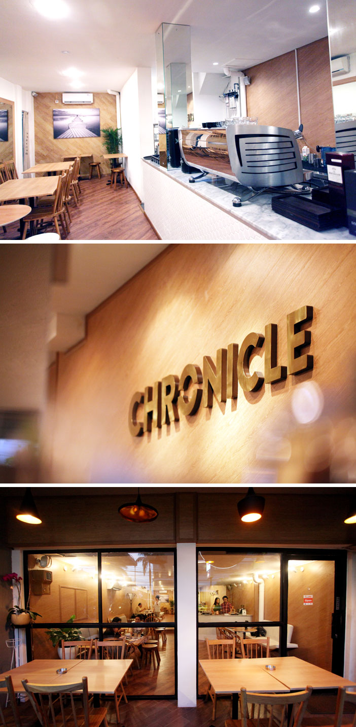 Tempatnya berbentuk memanjang dengan lebar sekitar 3 meter dengan dominasi material kayu coklat. Di bagian bar Anda bisa melihat mesin espresso Black Eagle yang merupakan tipe terbaru dari pabrikan Victoria Arduino, Italia. Untuk Indonesia, Chronicle merupakan tempat pertama yang menggunakan mesin espresso kelas high-end seperti Black Eagle.