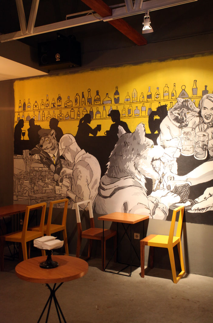 Pemesanan kopi dilakukan di bar bagian bawah sebelum pengunjung dipersilakan naik ke lantai atas untuk memilih tempat duduk. Saat di atas, pemandangan yang paling mencolok tentu saja mural berupa lukisan yang menggambarkan suasana sebuah bar dengan tokoh artifisial berupa serigala yang bersifat nocturnal tengah menikmati kehidupan malam.