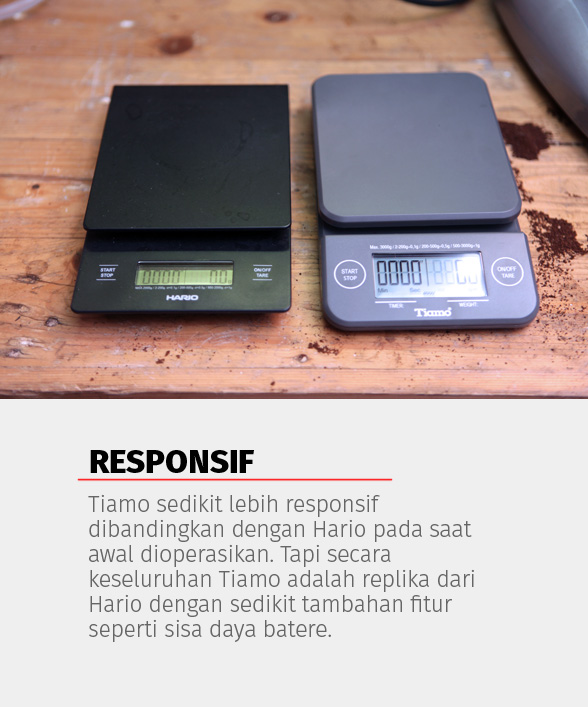 Jadi apa perbedaannya ? Satu fitur tambahan adalah kehadiran daya tahan batere yang ditampilkan pada layarnya selain, menurut saya Tiamo agak sedikit lebih responsif dibandingkan dengan Hario pada saat awal dinyalakan. Oh ya, satu lagi yang penting, perbedaan kapasitas maksimal Tiamo yang lebih besar 1kg atau bisa mengangkat beban hingga 3 kg. Sedangkan Hario hanya mampu mengukur berat maksimal 2 kg, itu saja.