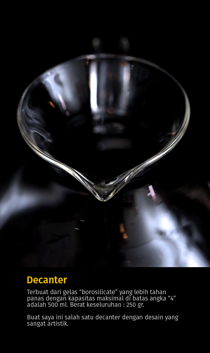 Untuk sementara biarkan saya menikmati desain decanter Silvertone yang cantik dan penjelasan selanjutnya bisa Anda tanyakan langsung kepada Maharaja Coffee di nomor telepon +62 21 6248148yang menjual alat ini.