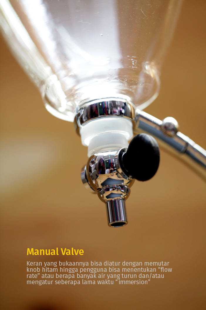 Ini bagian terakhir di glass cone, sebuah keran yang bisa dibuka tutup atau dibuka sedikit demi sedikit. Bila digunakan untuk pour over, pengguna bisa mengatur keluaran air atau flow rate dengan memutar valve yang berwarna hitam.