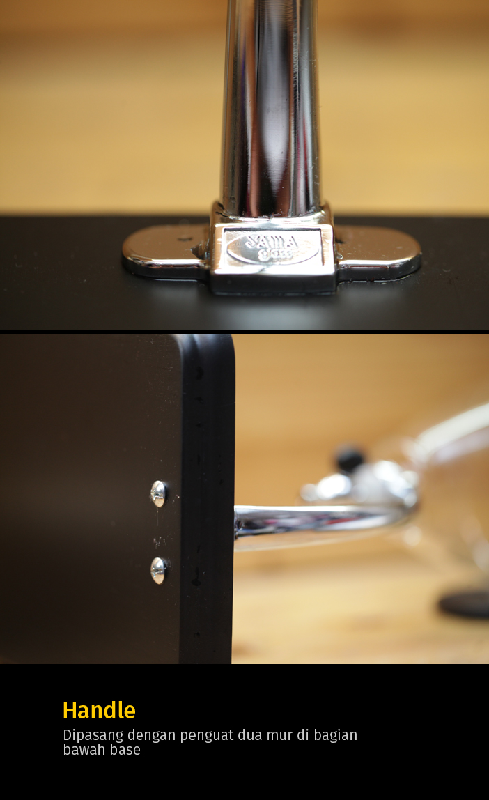 Handle untuk kedudukan gelas cone cukup mudah dipasang dengan dua sekrup yang harus diletakan dibagian bawah dan tinggal diputar hingga kedudukannya stabil. Sedangkan cone gelas menggunakan sekrup lain yang pemasangannya harus dilakukan ekstra hati-hati karena saya kemarin sedikit kesulitan bila tanpa dibantu seseorang untuk memegang gelas agar tidak terjatuh.