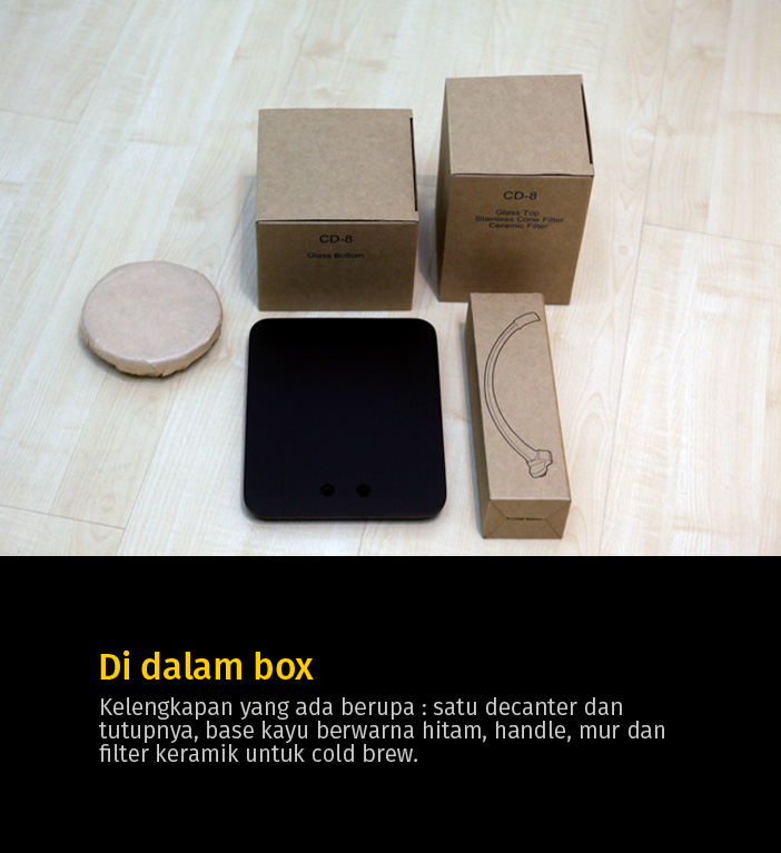 Kelengkapan yang disertakan berupa handle untuk kedudukan filter, decanter beserta tutupnya, base yang terbuat dari kayu yang dicat hitam, dan sekrup untuk instalasi keseluruhan alat ini. Satu keramik bediameter sekitar 5 cm juga disertakan yang digunakan untuk cold brew, yang belum saya coba saat tulisan ini dibuat.