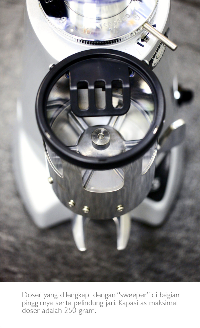 Sistem doser memang didesain untuk penggunaan kopi dalam volume yang cukup tinggi, dengan kecepatan putaran burr sebanyak 1350 RPM. Saya belum mengukur kecepatan giling untuk 20 gram, tapi diperkirakan untuk kelas komersial Fiorenzato F5 sudah mencukupi (catatan Saya hilang, tapi sekitar 15 detik untuk 20gram).