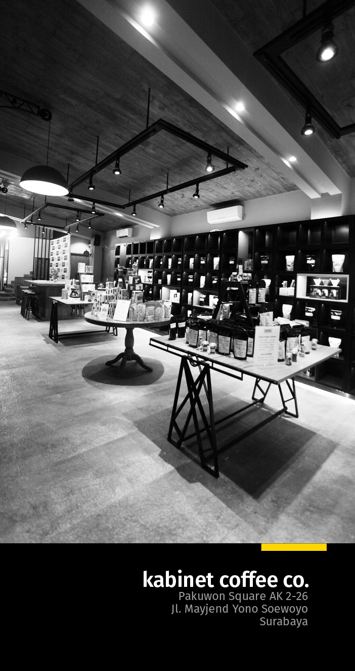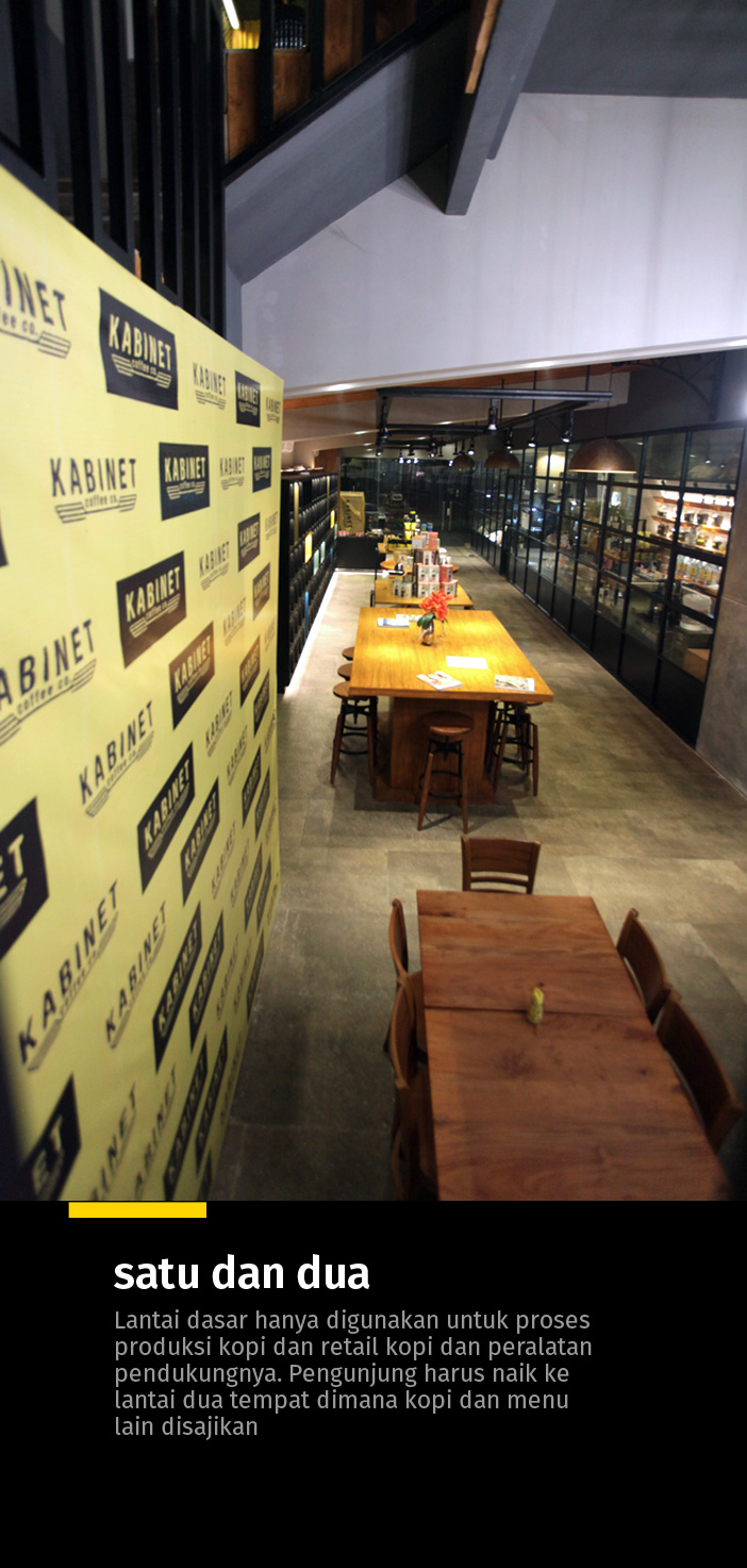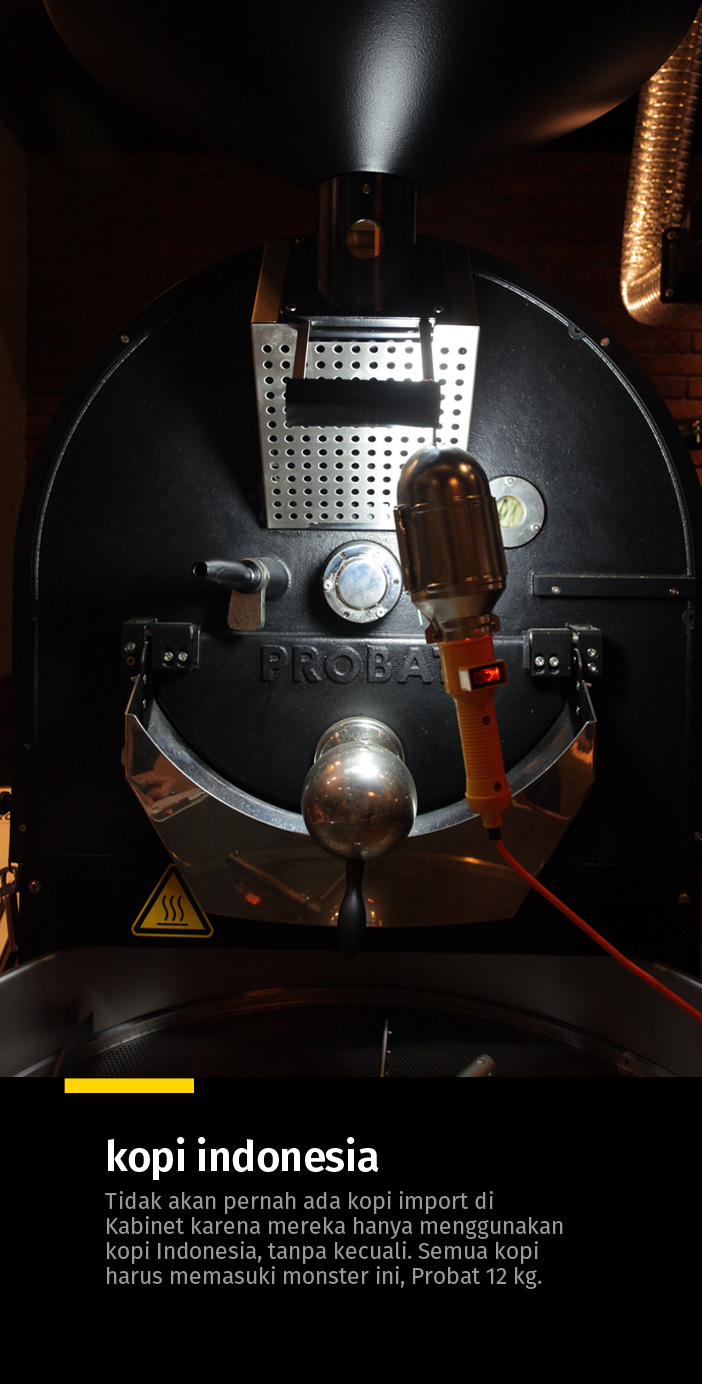 Bergaya industrial warehouse dengan dominasi kaca berbingkai besi bercat hitam dan penggunaan furniture kayu, Kabinet menempati luas 8×27 meter yang terdiri dua lantai utama. Saat Anda memasuki kabinet, di bagian kiri terdapat ruang roasting yang dibatasi dengan dinding kaca hingga pengunjung bisa melihat langsung pada saat Piter melakukan tugasnya.