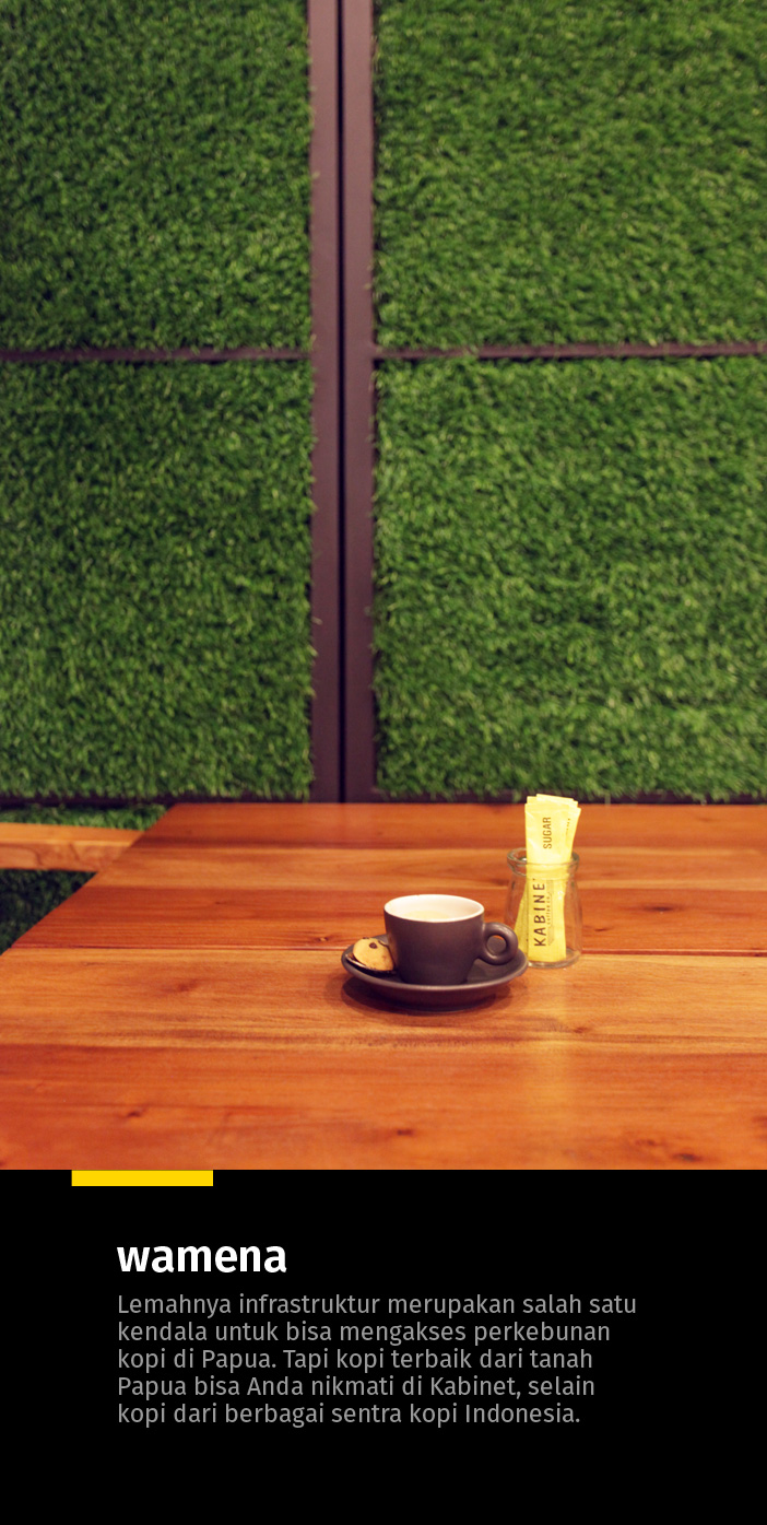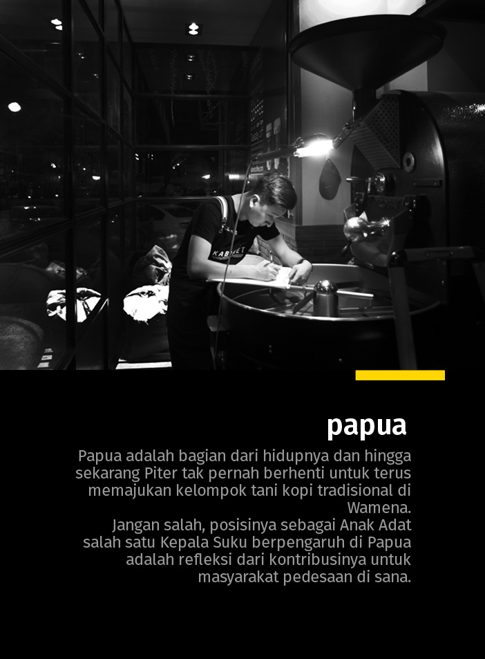 Sejak pendirian Kabinet, Pieter sudah berkomitmen untuk tidak menggunakan kopi import, apalagi ia sudah punya jam terbang panjang dalam melakukan pembinaan petani kopi tradisional di daerah pedalaman Papua, khususnya di lembah Wamena.