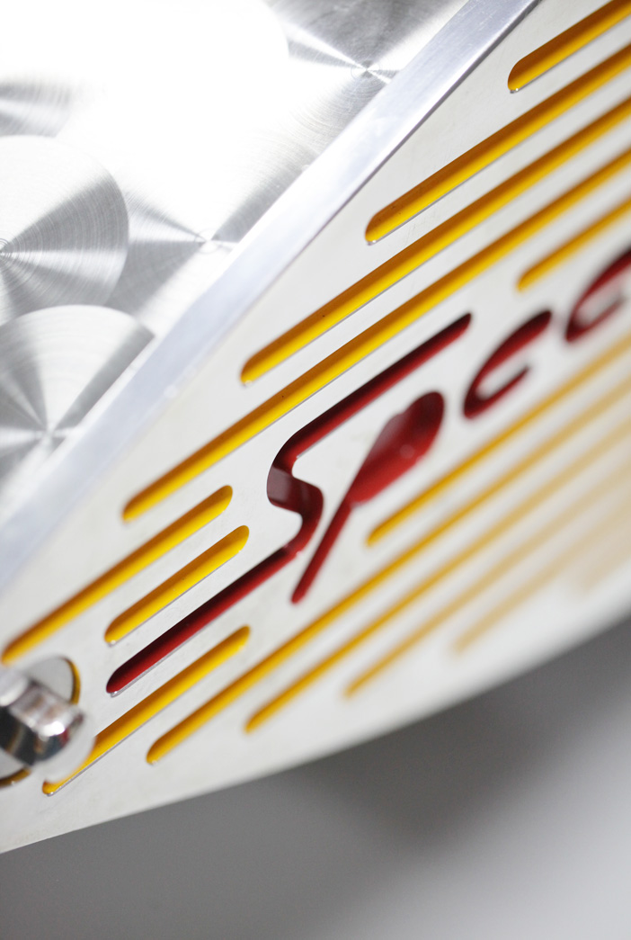 Kesan pertama tentu panel alumunium dengan garis embos berwarna kuning dan tipografi bergaya tahun 60an. Speedster mengeluarkan variasi warna lain yang bisa dipilih calon pembeli, merah, hitam dan kuning seperti yang yang saya coba.