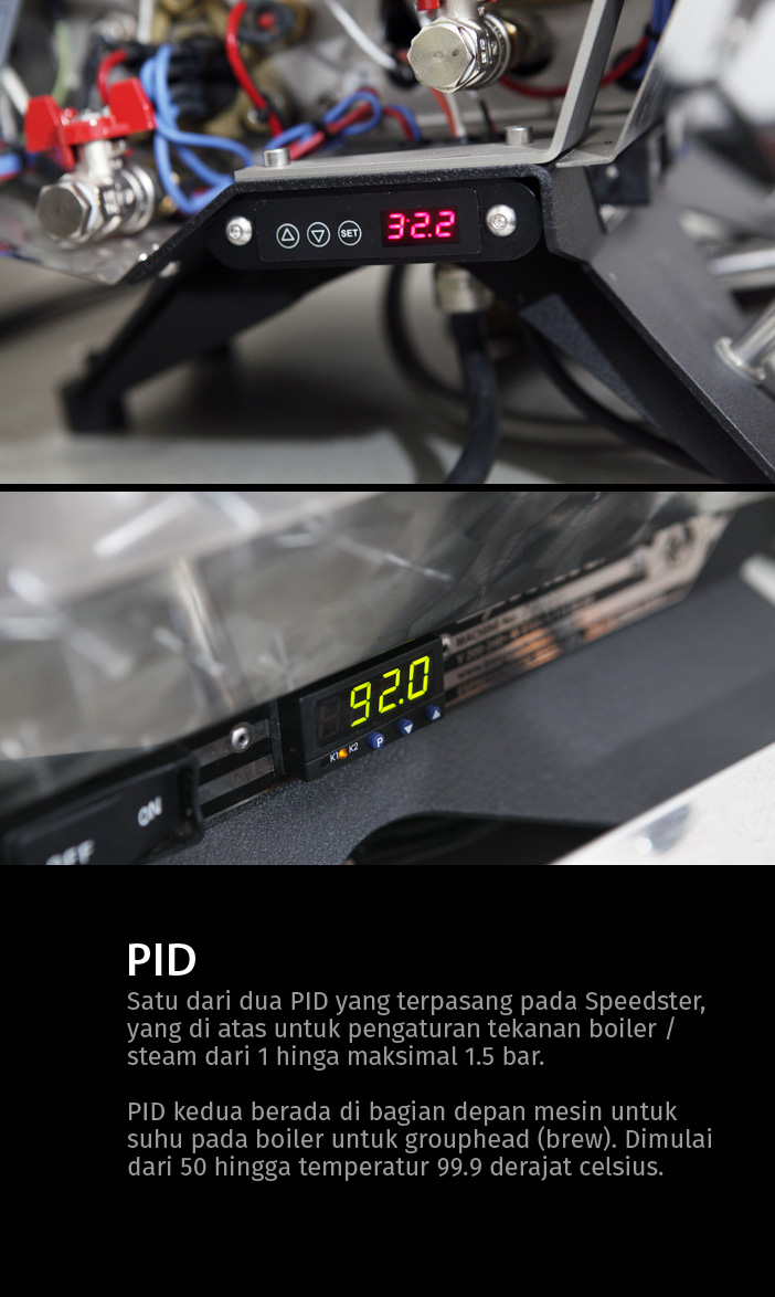 Terdapat dua komponen PID yang terpasang pada Speedster, yang pertama berfungsi untuk mengatur tekanan pada boiler utama atau steam. PID kedua yang berlokasi di bawah brew-head bertugas untuk menentukan suhu. Kedua parameter tersebut bisa dilihat angkanya pada manometer yang terletak di kanan dan kiri panel.