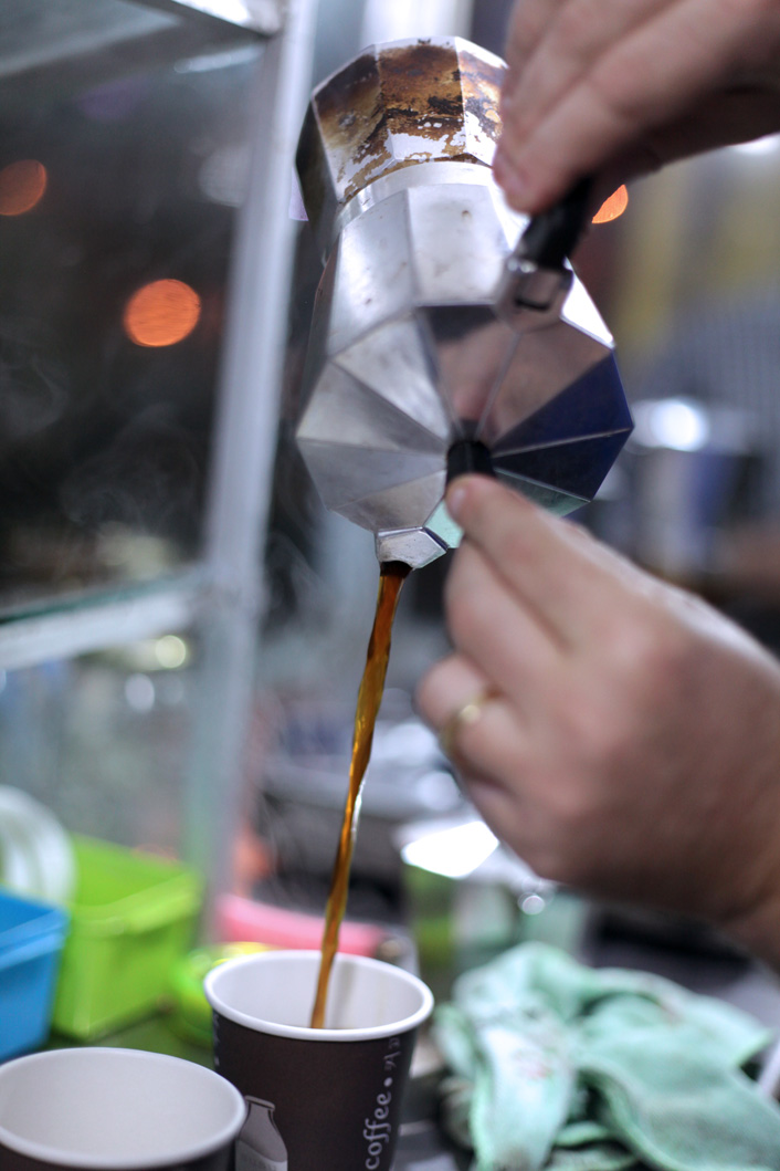 Lalu menyalakan kompor gas satu tungku dan sesaat kemudian tekanan udara yang dihasilkan akibat panas membuat kopi mulai naik ke atas hingga habis. Kopi dari moka pot ia tuang ke dalam cangkir kertas bertepatan dengan akhir Aria yang masyhur ini, Vincero !