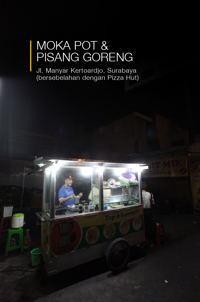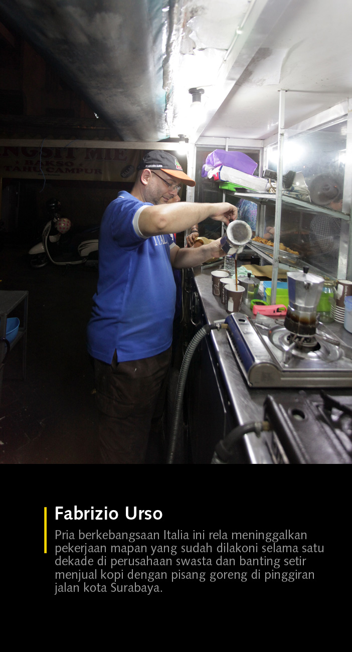 Ketika Fabrizio Urso (40) memutuskan untuk berhenti bekerja dan mencari bisnis baru, istrinya yang orang Indonesia memberikan saran untuk membuka warung kopi kaki lima di kota Surabaya. Usulan yang hingga kini menjadi kegiatan sehari-hari yang dilakoni pria berkebangsaan Italia ini. Sebuah gerai yang beri nama “Moka Pot Kopi dan Gorengan” mengisi malam bagi para pencari secangkir kopi dan berbagai kue yang ia jajakan di sebelah Pizza Hut, Jl. Manyar Kertoarjo, kota Surabaya.