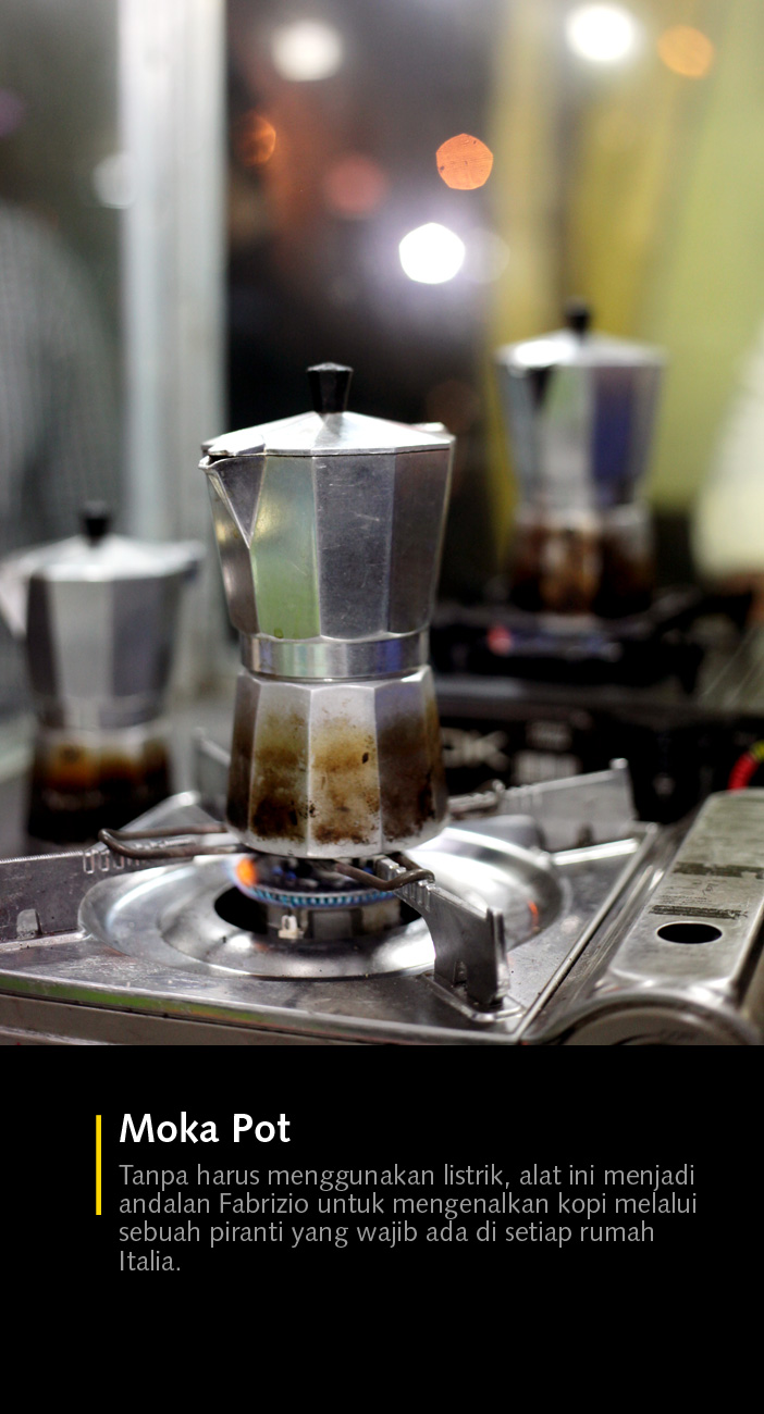 Sambil menyanyikan Nessun Dorma sebuah Aria “Turandot” mahakarya Giacomo Puccini, tangan Fabrizio sibuk mempersiapkan peralatan moka pot yang akan ia gunakan untuk memenuhi pesanan kami. Ia mengisi kopi ke dalam basket setelah bagian bawahnya ia isi air secukupnya.