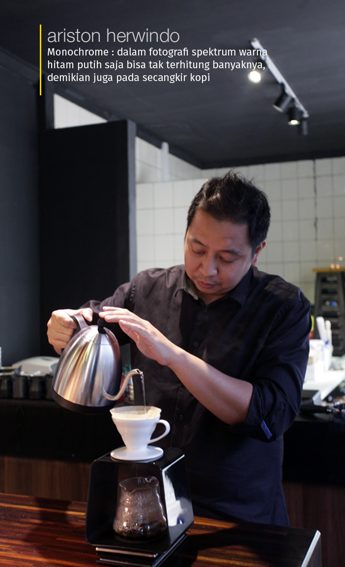 Dengan luas sekitar 60 meter persegi, Monochrome yang namanya diambil dari salah satu istilah fotografi untuk yang mencoba untuk merefleksikan bahwa kopi juga punya kekayaan spektrum rasa sebagaimana gradasi warna dari hitam ke putih.