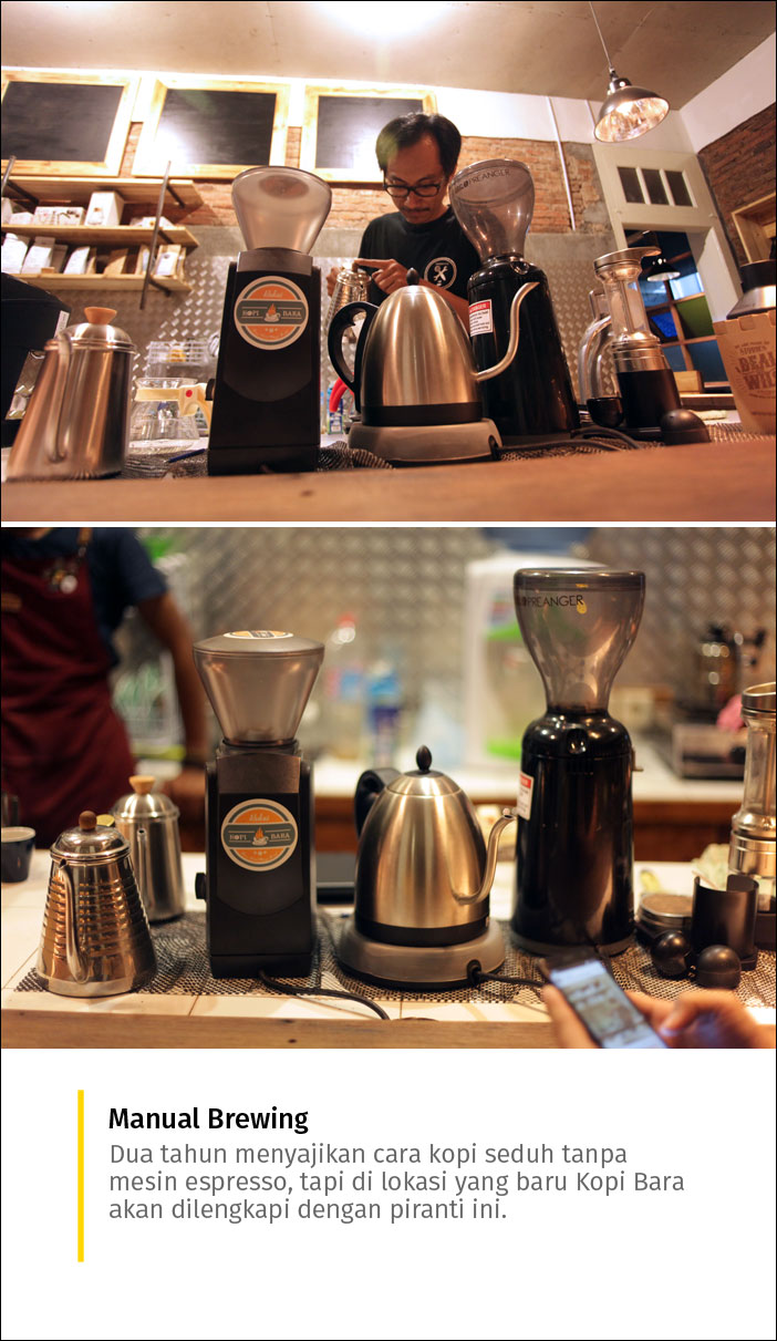 Mereka sudah beredar sejak tahun 2013 dan pertama kali mangkal di Jl. Aceh dekat perempatan jalan Merdeka Bandung. Dinamai Kedai Kopi Bara, karena bagaikan bara api, semangat mereka tak boleh padam, begitu kata Eri Wibowo, salah satu pendirinya. Boleh dibilang salah satu yang pertama hadir mengenalkan sajian manual brewing kini lokasinya kini pindah ke rumah tua di Jalan Cibadak 237 Bandung.