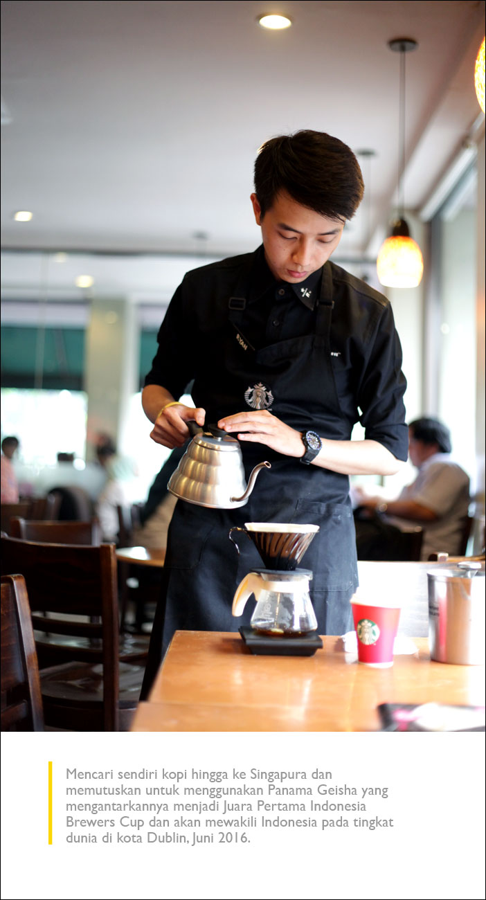 Lajang kelahiran Jakarta ini sudah berkarir selama 4 tahun sebagai Barista sekaligus menyandang posisi sebagai Coffee Master yang ia dapatkan di tahun 2013. Coffee Master yang bisa dikenali dengan apron berwarna hitam adalah karyawan (Starbucks menyebutnya sebagai partner) yang telah melalui program khusus sebagai model terbaik yang menguasai teknis dan detail penyajian kopi di perusahaan ini.