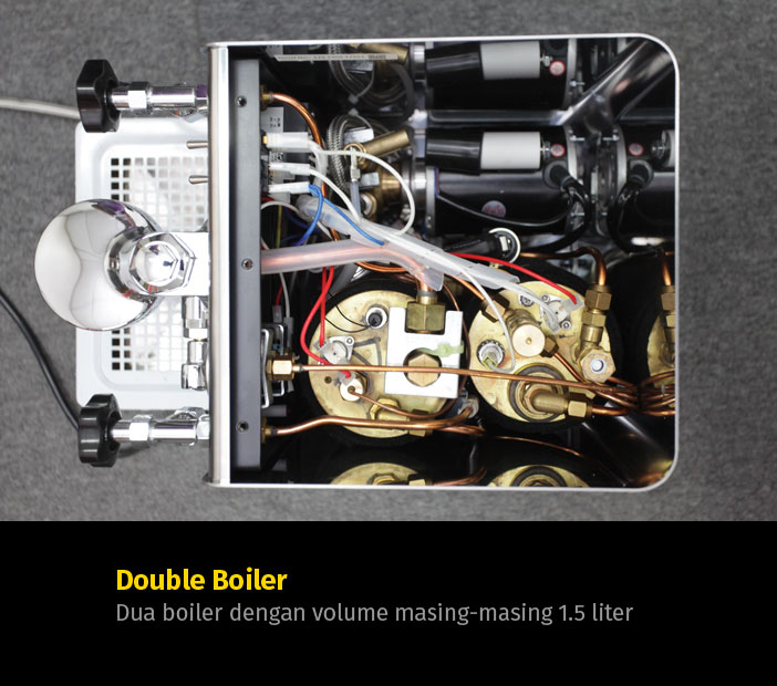 Office Leva dari Expobar tipe ini mengusung fitur dua buah boiler yang digunakan terpisah atau independen untuk keperluan seduh dan steam. Biasanya boiler untuk keperluan seduh atau brew lebih kecil dibandingkan dengan steam susu, tapi Expobar menyamakan volumenya yang masing-masing berkapasitas 1.5 liter.