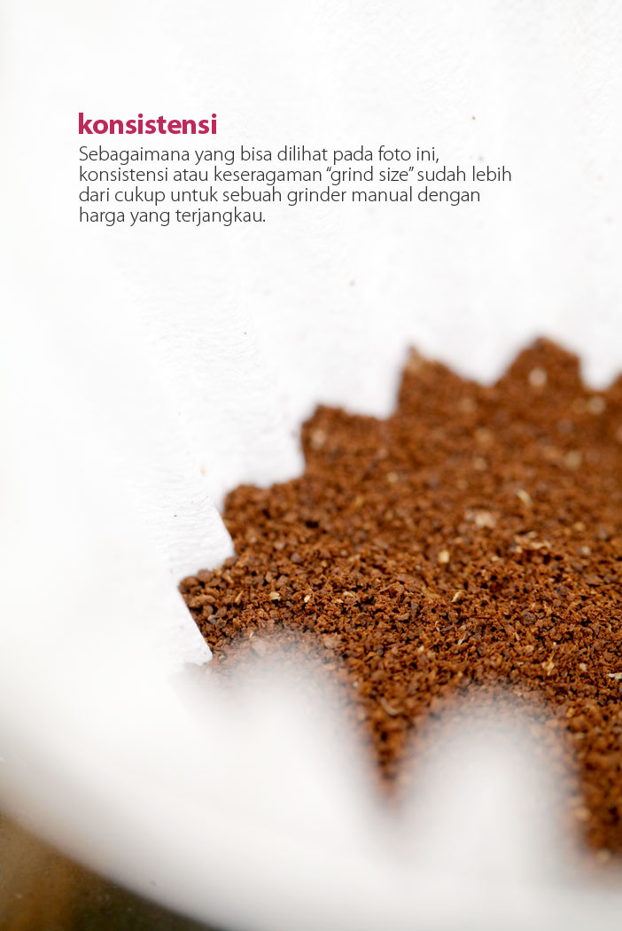 Pak toni, saya ada grinder semacam ini tapi tanpa merk, sama persis luar dalam, saya beli seharga 200rb, tp kelemahannya, konsistensinya apabila sudah agak lama digunakan akan parah, untuk 18gram kopi, pada mulanya gilingan fine, lalu lama2 akan sebesar gilingan tubruk..