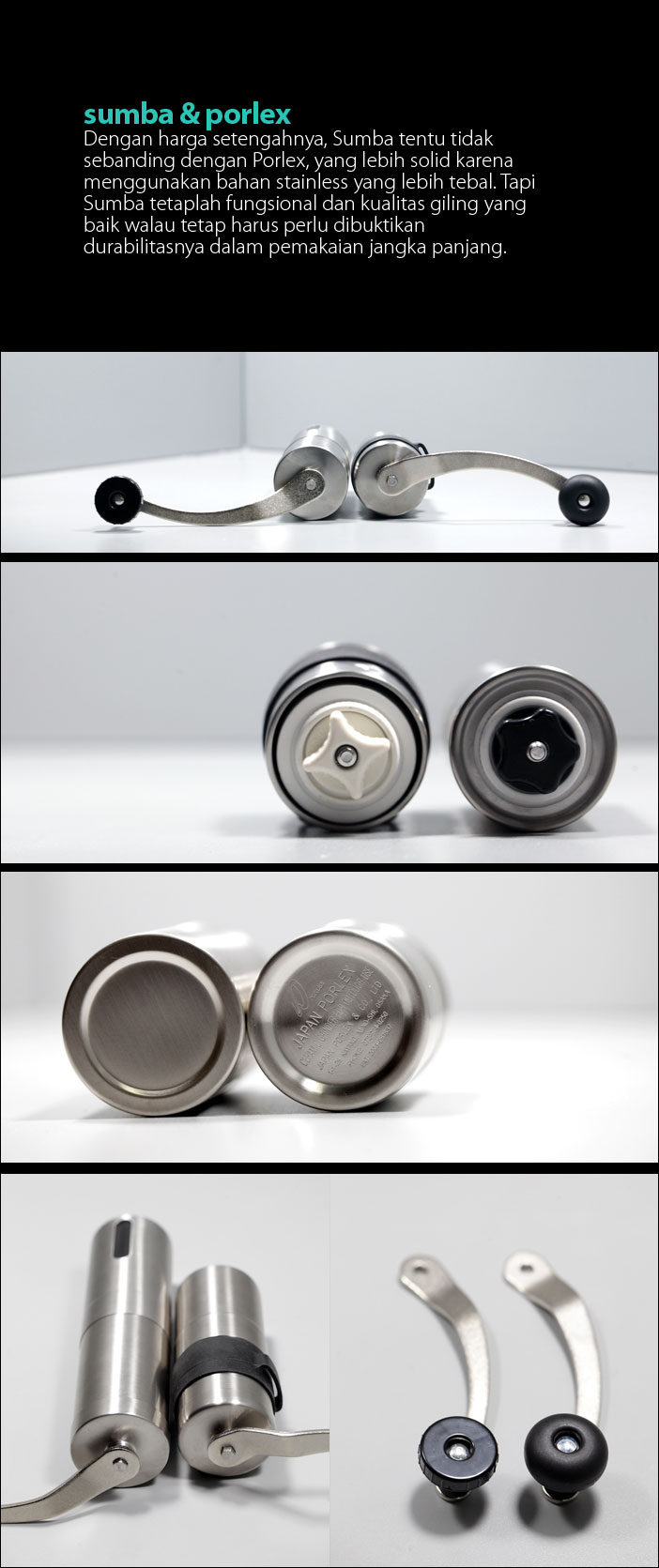 Dari sisi desain atau bentuk fisik, grinder Sumba tentu saja seiman dengan Porlex, pendahulunya yang jauh lebih populer. Sekilas tidak ada perbedaan mencolok kecuali menurut saya, Porlex yang juah lebih kekar karena menggunakan bahan stainless yang lebih tebal dan permukaannya yang lebih mantap untuk dipegang saat dioperasikan.