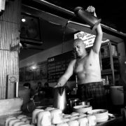 “Kalau saya pake baju, itu artinya saya lagi gak buka warung kopi” kata Thio Tiam Siang (61) yang lebih masyhur dikenal dengan nama Asiang, pemilik kedai kopi dengan nama yang sama di jalan Merapi, Pontianak. Dengan badan berpeluh keringat, kedua tangan Asiang seakan tak pernah berhenti dalam melakukan atraksi teatrikal dengan mengangkat tinggi-tinggi teko yang isinya kopi saring ke dalam cangkir. Dibantu istri dan lima orang pegawainya, Asiang sudah sejak jam 3 pagi membuka warungnya hingga tutup sekitar jam 1 siang. Asiang adalah sebagian dari kultur kopi di kota Pontianak yang saya sajikan dalam tulisan singkat di bawah ini.