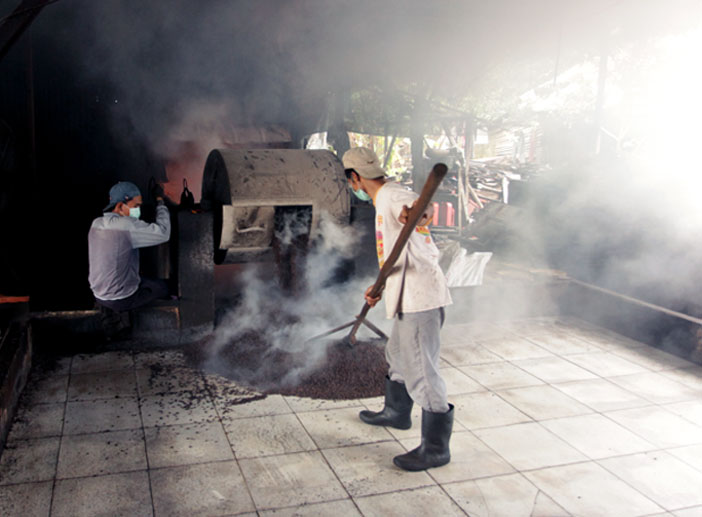 Bangunan yang sudah mulai menua ini dilengkapi dengan 3 tungku api dengan pijaran api yang memanaskan drum yang diisi 150 kg biji kopi. Tujuh orang karyawan sibuk dengan kegiatannya masing-masing, beberapa sedang merapikan kopi yang baru saja selesai didinginkan, yang lain mulai memasukan kopi ke dalam karung plastik berwarna putih untuk dikirimkan kepada para pelanggannya.